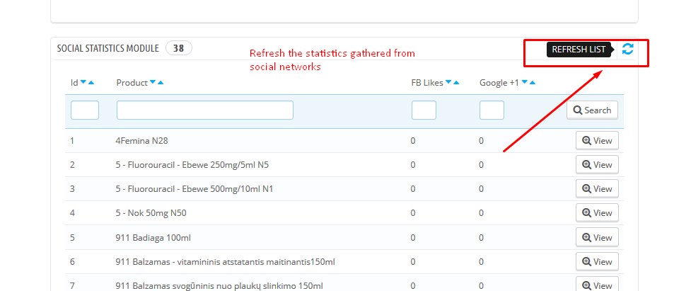 Le module ajoute un widget spécial au tableau de bord qui affiche les J’aime Facebook et les J’aime G+ pour chaque produit du catalogue. Le module fonctionne avec PrestaShop >1.6.0.